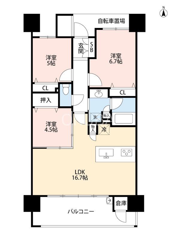 | 築年月 | 2016年2月 | 間取り | 3LDK( LDK16.7畳(9階)/洋室6.7畳(9階)/洋室5畳(9階)/洋室4.5畳(9階) ) | 専有面積 | 72.16m2 |